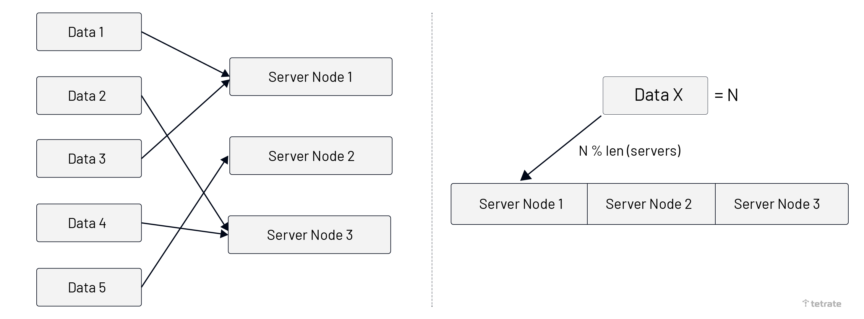 1. The left side represents that the same data content always is routed to the same server node.