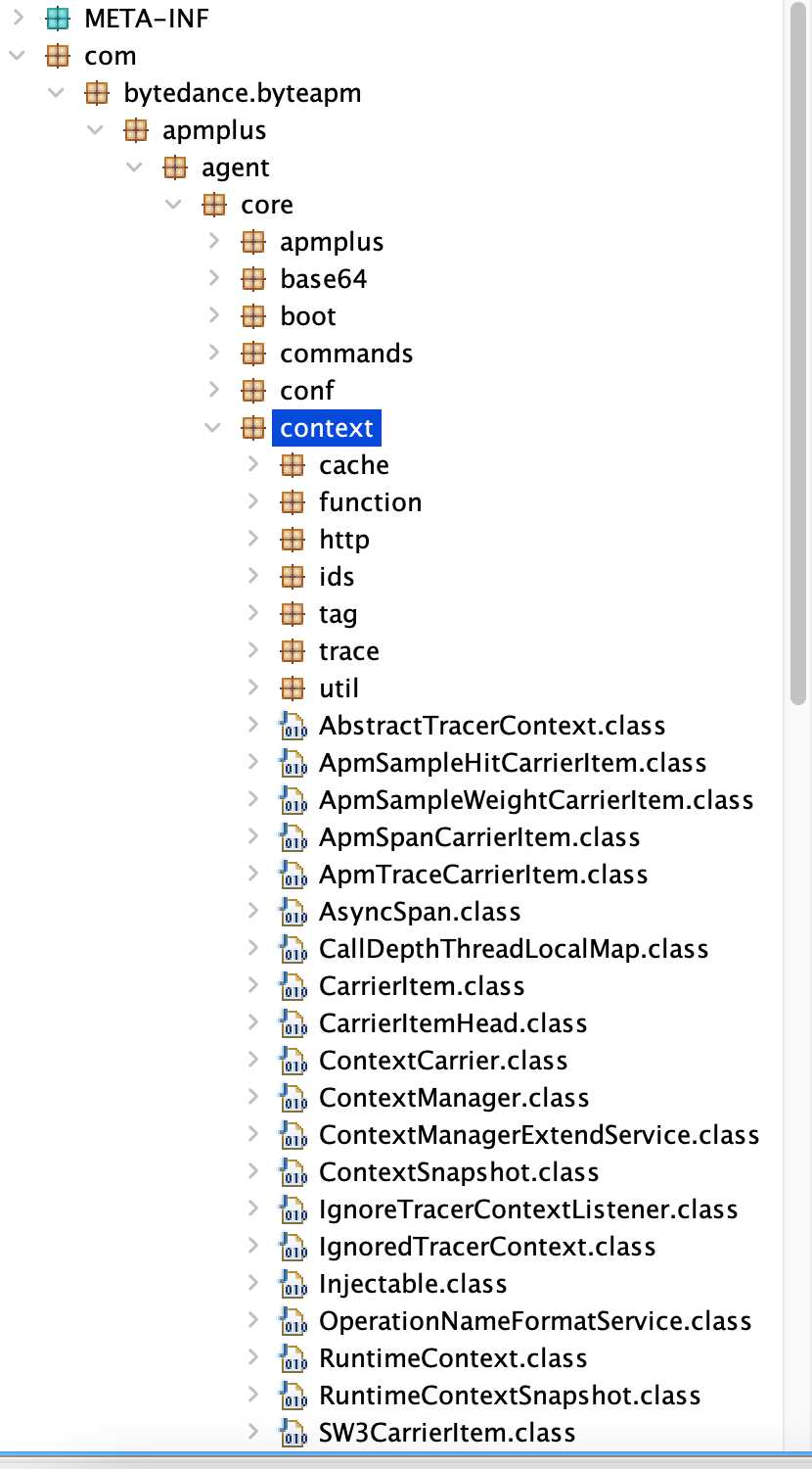 apmplus-agent.jar, Volcengine’s agent core jar, you could easily find several core classes exactly as same as SkyWalking’s.