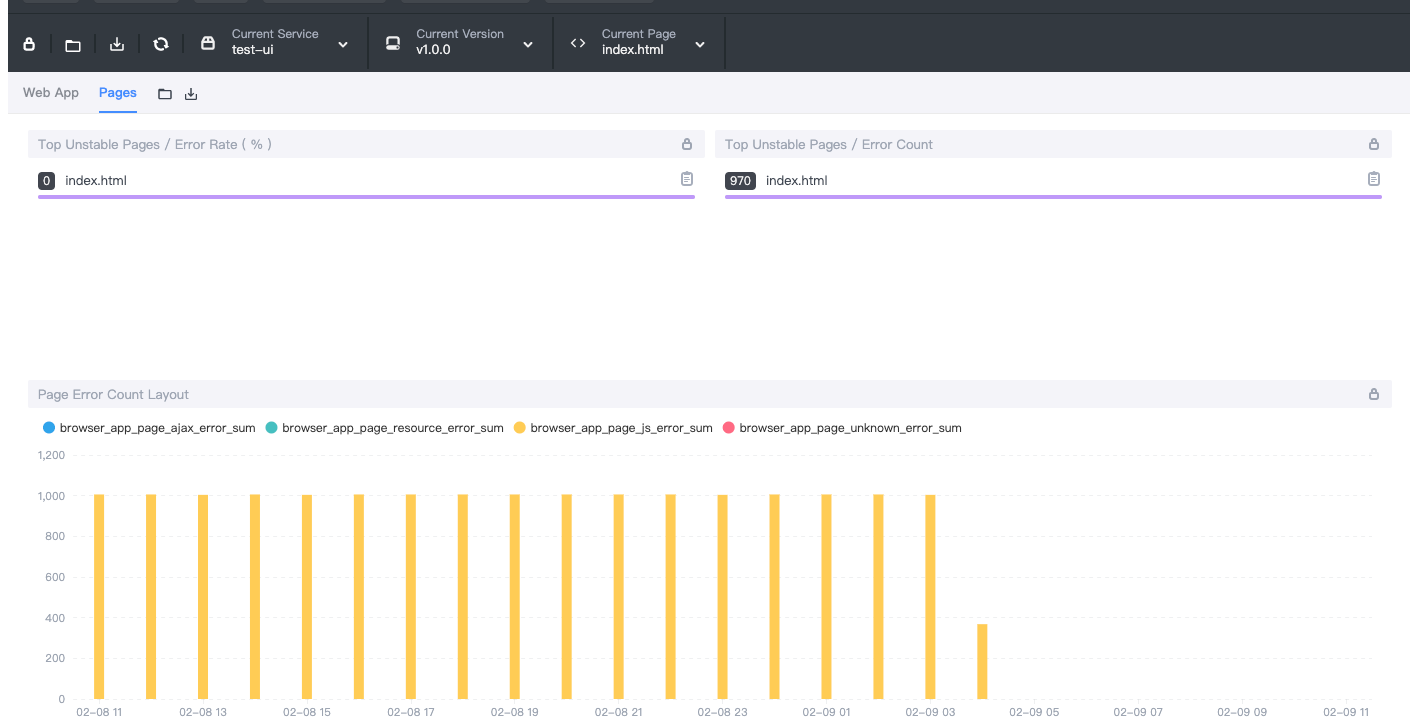 - Top Unstable Pages / Error Count, Top N Error Count pages of the Selected version ranking.