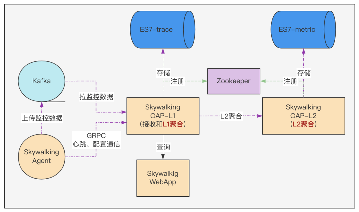 - 图中L1聚合的意思是:SkyWalking OAP服务端 接收数据后,构建metric并完成metric 的Level-1聚合,这里简称L1聚合。